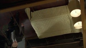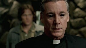 Father Gil grabs Dean and strangles him, lifting him off his feet, his boots dangling.