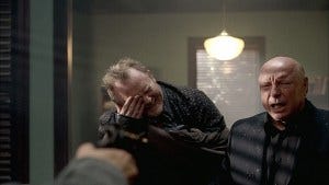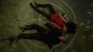 Sam turns around to see Father Gil’s eyes go black and then there’s a gunshot that just misses him. It’s Bobby, but the Father tosses him over and then throws Sam into the car windshield. Sam struggles up and helps Bobby.
