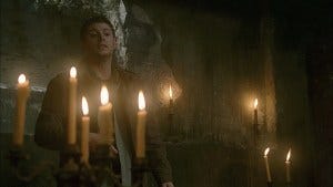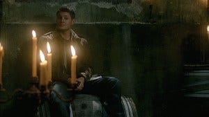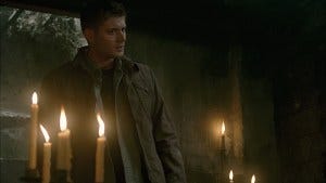 Dean lights candles and the whole scene is quite beautiful, two beautiful people playing out a little bit of the enemies to lovers trope that fanfic loves. Dean tries to remember the exorcism.