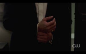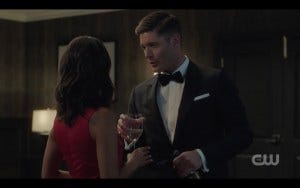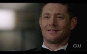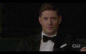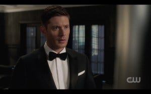 I was so distracted by what Ackles looks like in a tux (and that invitation to objectify that I mentioned) that I got caught off guard by what happened next – Michael’s reflection in the mirror is suddenly not Michael, but Dean! I gasped out loud and threw my hand over my mouth, instantly overwhelmed with unexpected emotion. I realize Dean hasn’t been gone long, but I think the anticipation of Dean being gone and the intense way I missed him the entire first episode had an impact. So seeing him suddenly make an appearance made me very emotional!