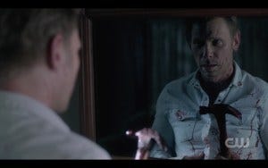 Anyway. Despite that, Misha makes Castiel’s feelings believable. It clearly is uncomfortable for him to interact with Nick, yet he gently tries to answer Nick’s anguished question of why he would have let Lucifer possess him, explaining that he was in a lot of pain because his family was murdered. In a flashback, Nick remembers his family and their horrific death, exclaiming “Ohmygod, who could do that? That was a monster – and Lucifer found me and made me a monster too!”