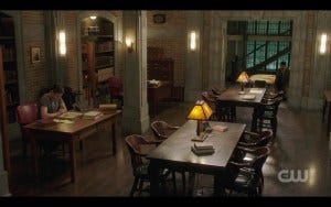 Back to Cas and Jack at the bunker. There’s a beautiful shot of Jack sitting in the MoL library studying the lore on how quickly Archangel grace replenishes. Speight knows how to set up a shot to take advantage of the beauty of the MoL set, and I appreciate it. Misha and Alex Calvert hit all the right notes in this scene, as Cas tries to help Jack get past grieving over what is lost and instead focus on the future.