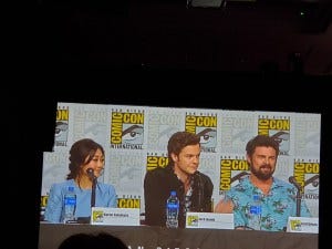 I was very excited to attend the press conference for Eric Kripke’s new show, The Boys, after experiencing the activation installation at Comic Con last weekend. Instead of round table interviews, invited press sat in front of the panel, and cast and Kripke and took turns asking questions. Eric recognized a few of us and gave us a friendly nod, which I admit made my fangirl heart happy. You were supposed to wait for the room person to give you the mic in order to ask a question, which meant I was having a near panic attack trying to get her attention while other people just yelled theirs out. Finally I got a turn to ask a question – one for Mr. Kripke.