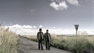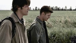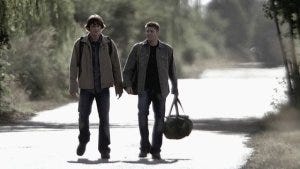 The brothers walk along a path through the woods in what has become an iconic scene from the show. Where they are is so beautiful, and looks so empty – it just evokes so much of that open road Midwest feeling that characterized the show in its Kripke era, and it paints Sam and Dean as so much a part of that, carrying their duffels with everything they own in the world and brushing shoulders as they walk. They look alone in the world, just the two of them and their knowledge of what’s really out there.
