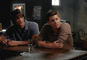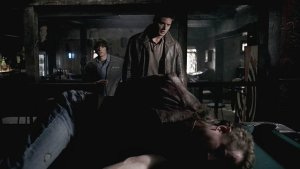 The brothers ask what she was offering to help John with, while Dean holds a bag of ice to his probably swollen lip. Just sayin.