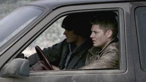 In the car, the boys banter about Sam’s fear of clowns; Sam retaliates with Dean’s fear of flying. Dean protests.
