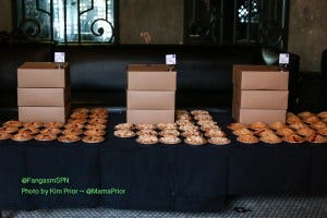 At this point, I was despairing, certain that there was no way this party could possibly come together. But I had underestimated the niceness of the SPN Family. Someone at the downtown Pie Hole store offered to drive all 150 pies over to the local one! SPNFamily to the rescue! Kathy, intrepid fangirl that she is, managed to schlep all the books in with the generous help of a friend, which had to be no mean feat at all. Thank you Kathy! (check out all her photos at WickedGoddessPhotography.com). And the bookstore guy finally found the venue! We had pie, we had books, and we had….about fifteen minutes to finish getting ready.