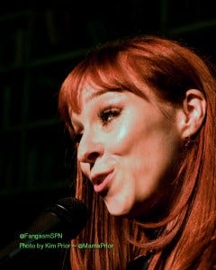 Ruth: I’m not a very good sight reader, and my chapter is a bit about that. I’m not great with my own voice and my own words. So one of the things I want to thank Lynn for in this book is giving me the opportunity to find my words. In writing the chapter, I wrote about singing at conventions, which I can do because you guys clap for me no matter what. This has been such a gift, but I hope that if you read my chapter you’ll know that it’s something much bigger. Supernatural has been the biggest thing that’s happened to me in my life. When I was first asked, I was nervous to write the chapter, wasn’t I?