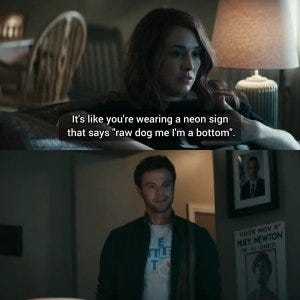 Maeve also ultimately gives up being a supe, though not entirely by choice. Maeve escapes (and yes, those van drivers were collateral damage, though we can feel better about it if we decide they were evil Vought employees…). She reunites with Annie and Hughie at MM’s, inexplicably greeting poor Hughie with “It’s like you wear a neon sign that says raw dog me, I’m a bottom” – a rather pointed illustration that it’s not just other men who prop up the tropes of toxic masculinity.