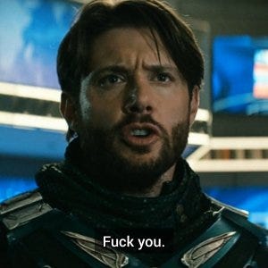 I had a really hard time watching that scene and I don’t think I can rewatch it for some time. I wanted Soldier Boy’s vulnerability to win out, and it didn’t. I wanted him to actually DO what he says he wanted to do – be different than his father. Be a different type of man and a different type of parent to his son (and grandson). He wants it, but he’s too flawed to actually do it, having bought into the same impossible standards his father set for him. It wouldn’t be nearly as painful if a) it wasn’t Jensen Ackles and Antony Starr absolutely killing it, and b) it didn’t happen that way in real life sometimes too.