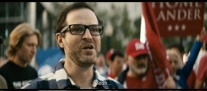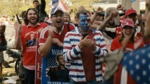 Protestors, spot on social commentary popping, attack the media, dressed in red white and blue, flags everywhere, tee shirts with “Sorry, Snowflake” and Homelander on them.
