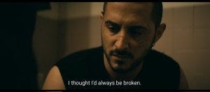 He looks anguished, close to sobbing, parroting the words of his own father, his face collapsing, but there’s so much rage there too – at his father, at the betrayal that kept him from raising his own son, at himself – full of self loathing and now confronted with it in his own child.