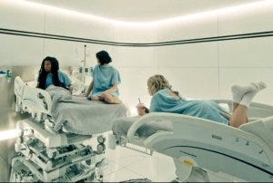 Marie (still alive after having taken Homelander’s blast “like a fucking champ”), Emma, Jordan and Andre wake up in hospital gowns in a hospital room – with no doors.