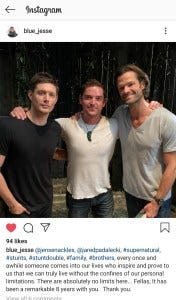 Jensen’s stunt double, Jesse, also posted his Instagram gratitude to Jared and Jensen, thanking them for a wonderful eight years. Am I imagining it, or can you see the sadness on their faces even beneath Jared’s smile for the camera? So many goodbyes…. that’s a hard thing for us humans.