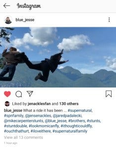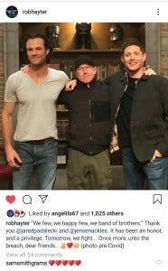 Stunt coordinator Rob Hayter posted an emotional thank you. I had the privilege of watching Rob choreograph a complex fight scene with Jared and Jensen a few seasons ago, and also of hearing from them how wonderful it is to work with him. It’s hard to believe they’ll be filming their final fight scene together. I hope Rob knows how much he’s enriched this show and how much Jared, Jensen and Misha appreciate him.