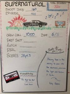 There are two more filming days left for Supernatural, it seems. Monday is a holiday, so I’m assuming they’ll film the last scenes on location on Tuesday and Wednesday (I think, if all goes as planned). Jason Fischer was asked if they still planned to film the actual final scene last, and while he didn’t answer definitively, that seems to be the plan. Someone on twitter yesterday asked composer Jay Gruska if we’d hear Americana again before the end, and he made it pretty clear the answer was yes. Those two bits of information suggest that Tuesday and Wednesday will be heart-wrenching and difficult scenes – both for us to watch and for the actors to film. When they do film that last scene ever, I hope they know that our hearts will be right there with them.