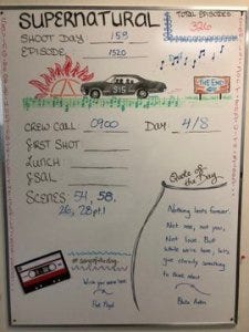 Friday was a big day – and an emotional one. Supernatural completed its last day of filming at the studios, which are now permanently known as the Supernatural Studios. Fifteen years of filming on those sets and the last scene there has been completed. Clif Kosterman recorded his last time driving through the studio gates, presumably with Jared and Jensen beside him, and even he got emotional about it.