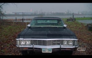 Cut back to 2003, as John Winchester wakes up to his flip phone ringing in the Impala, her license plate KAZ2Y5 clearly visible. It’s Dean. Sam is at Stanford.