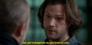 Sam eventually admits that yes, John did mess some stuff up, but says that when he thinks about his Dad now (and he thinks about him a lot – oh, my heart!), he doesn’t think about the fights.
