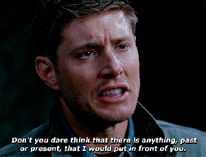 I’ve written many many times about why I love Dean, from his loyalty and love for family and friends and especially his little brother, to his fierceness when any of those are threatened. He wasn’t always one to talk about his feelings, but Dean didn’t shy away from showing affection to those he cared about.