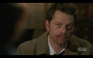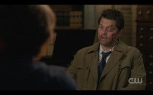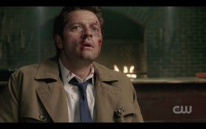 We return to the bunker in the aftermath, Sam holding a cold beer to his temple presumably where he got knocked on the head. Cas comes in, still as bloody and beaten up as he has been all episode. In fact, he hasn’t even bothered to wipe the blood from his chin where it trickled down! I’ll get to that, but I like this, another quiet scene that carried a lot of meaning.