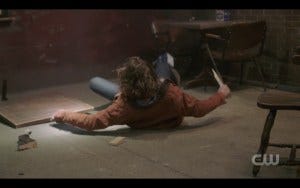 Despite Castiel’s confidence and his threat to burn Kip up right then and there, sure enough, in a surprise to no one but Cas, the horde of demons attack poor Castiel and beat him to a pulp. Ouch.