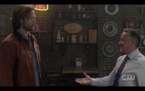 So what is Castiel up to while everyone else is at the bunker? He’s meeting with a demon, which is never a good idea. The demon’s name is Kip (Dean Armstrong, who owns the role), and he seems as surprised as I am that Cas asked to meet with him. Cas, for his part, is 1000% done from the moment Kip opens his mouth. He’s a snarky, oddly flirty, Crowley-wannabe and Cas has no time for his blah blah blah blah. His attempt to goad Cas with insinuations about the nature of his and Dean’s relationship meets with more of Castiel’s 1000% done face.