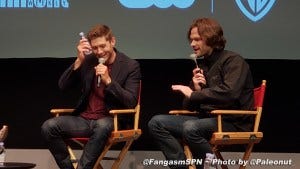 And here something odd happened during the live broadcast. One of the big reveals in this episode was that Mark Pellegrino is still on the show, back not as Lucifer (maybe) but as his vessel, Nick. That reveal happened in a great scene that builds up the tension with Sam walking into a dark room and seeing a figure from the back, and then Pellegrino slowly turning to reveal it’s him. When we saw that scene in the EW screening, there were loud gasps and then equally loud groans from the entire audience – that was one of the times that Jared burst into guffaws of laughter when he heard our reaction.