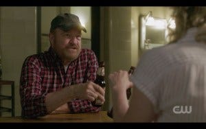 Side note: In the Q & A that followed the EW screening, Jensen Ackles commented hilarously on this scene, and on Sam holding the cold beer to his head – which was very cool to see, because he had just watched that scene for the first time too, so he was totally reacting as an audience member just like we do.