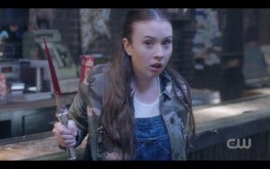 Sam, meanwhile, returns to the bunker, where a bunch of AU hunters have settled in and are carrying on as hunters do. I’m not sure why they’ve decided to incorporate AU resident Maggie (Katherine Evans) into this new season, but she serves as reality check and a bit of comic relief in this episode. Pulling a giant claw out of another hunter’s back, she states the obvious: “So so gross.”