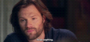Let’s take a brief shallow detour and talk about Sam’s facial hair, dubbed the “grief beard”. I don’t even usually like beards, but even I have to say that scruffy determined badass Sam Winchester is SO working for me!