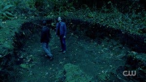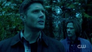 Sam and Dean wake up in the Vancouver woods, except it’s clearly not. Everything is in desaturated shades of blue, so we know we’re not in Kansas anymore.
