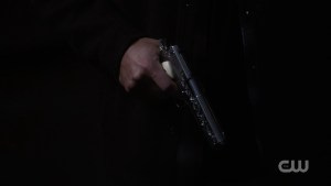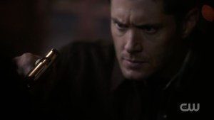 Dean interrupts him, pulling his gun and quietly cocking it.