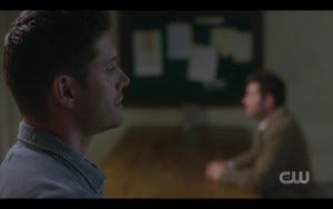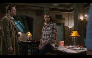 Dean has always wanted nothing more than for Sam to be happy, and there have been several times he’s tried to facilitate that happening for Sam through a romantic relationship. I’m not sure where Sam’s head is at, though; he says here and he’s said multiple times in the recent seasons that family life is not for either of them. Dean looks both soft and wistful and maybe fleetingly sad as he walks away, and Sam stares after him as he goes. What’s he thinking? I wish we had a convention coming up soon so I could ask them just what they were portraying their characters thinking in that scene!