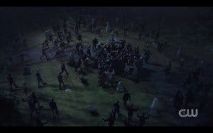 In the graveyard, the newly released souls animate the dead bodies buried there. Hundreds of them approach Sam, Dean and Cas. Part of me couldn’t help but see it as a shout out to The Walking Dead and Jeffrey Dean Morgan and another part kept hearing Jensen and Jared making fun of fighting zombies because they walk so slowly that anyone could get away.
