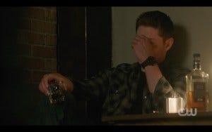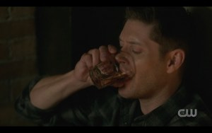 Sam walks out and Dean sits alone, literally backed into a corner. Jensen Ackles says volumes with the expression on Dean’s face, tormented and equally anguished. So much pain in his eyes, and so much determination in the set of his jaw as he downs a stiff drink. We know, in that moment, that he hasn’t changed his mind and that it’s killing him not to have Sam on his side this time.