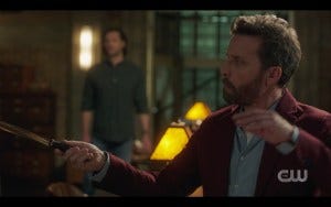 If you look at the episode from a purely meta perspective, it’s both fascinating and maybe disturbing. Is Chuck in this episode standing in for showrunner (and writer of this episode) Andrew Dabb? Chuck has long been considered an avatar of creator Eric Kripke, but Kripke hasn’t been the puppeteer for these characters in a while. This fandom is well known for speaking its mind (and its complaints). Some fans wondered if this was Dabb saying to fandom, “Oh, you don’t like what I’m doing (or the spinoffs that were attempted)? Then I’ll burn it all down!”