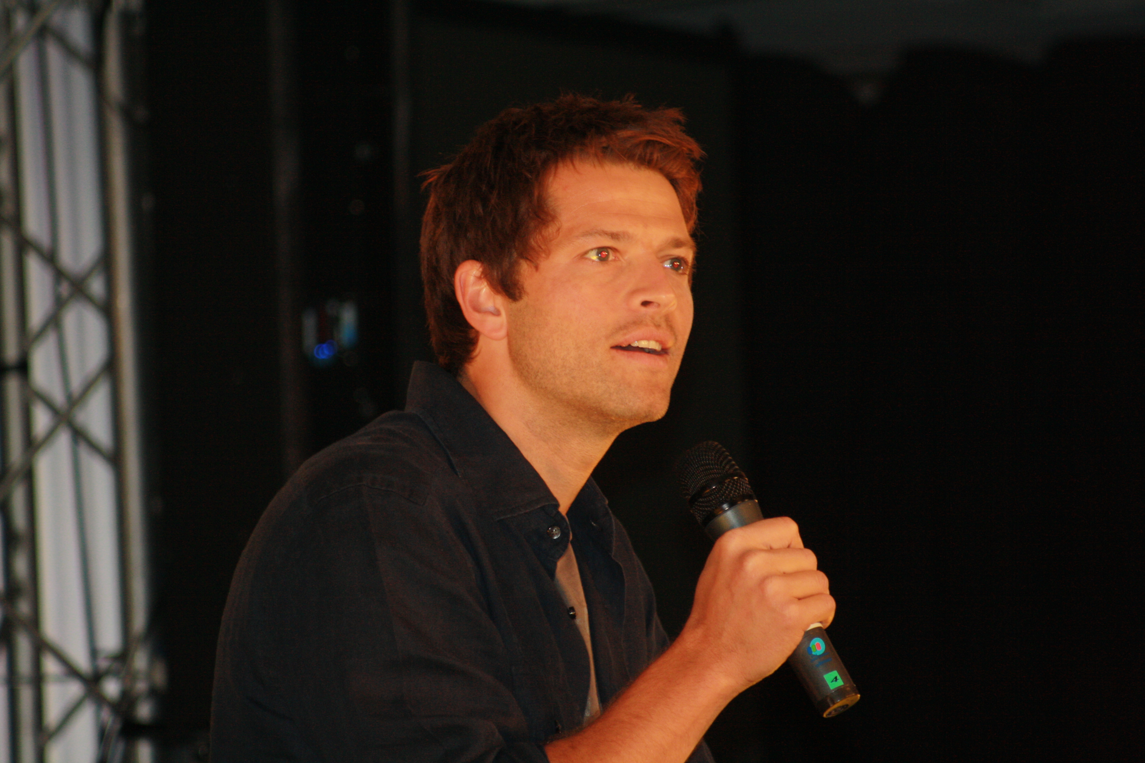 The last panel of the day was the J2 farewell show, but before that there was a successful charity auction. Misha Collins proved himself a talented auctioneer. And that he looks quite fetching in a red futbol jersey. (A fan had them made for all the guests, and they all immediately put them on. We don’t know how she got their sizes, but everyone’s jersey fit them like a glove. A very attractive glove).