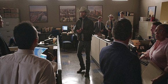 He takes her encouragement, though, puts on his hat and pulls the Rangers together to give them a pep talk. He reminds me of Sam Winchester in the bunker, becoming the leader that we all always knew he could be. Cordell steps up too, saying that James was the target and it seems this was a crime of passion – so they need to look into all James’ old cases for potential suspects. He also lets them know that the Captain is in a rough spot and he can’t promise them that everything will be okay, but that he did promise that they’d figure this out. He’s still worried about being in charge, saying that “the Star is only as good as the person wearing it, right? Right now the person wearing it is a little nervous, scared. I imagine some of you might be scared too, but that’s okay, we can use it for fuel. I keep asking myself, what would James do? We can honor him by bringing about justice – morally.”