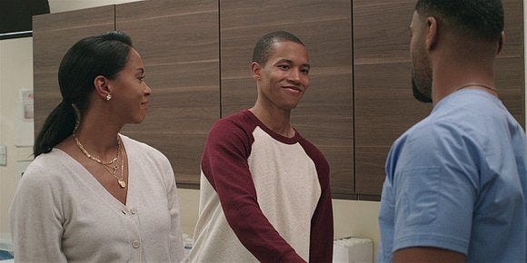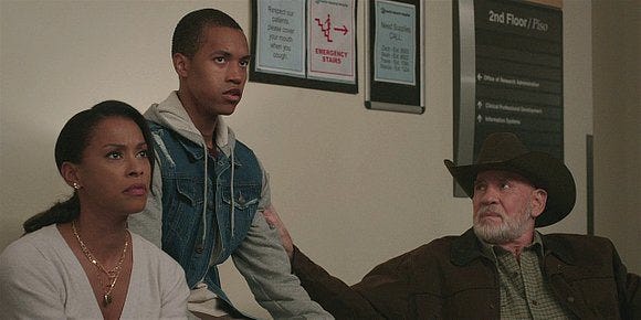 DJ (Joshua Brockington) visits his dad, worried but relieved. James’ ex wife Kelly (Kearran Giovanni) does too – Cordell greets her with a warm hug, and she hugs Trey too, thanking him for being there and saving the day. Trey’s got a blue scrubs top on to replace his bloody shirt and it looks quite fetching on him, gotta say.