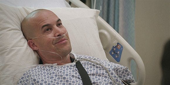 His heart rate drops alarmingly, then the machines start beeping and Cordell yells for help – which at this point means the crash cart! They ask Cordell to leave as they start the procedure.