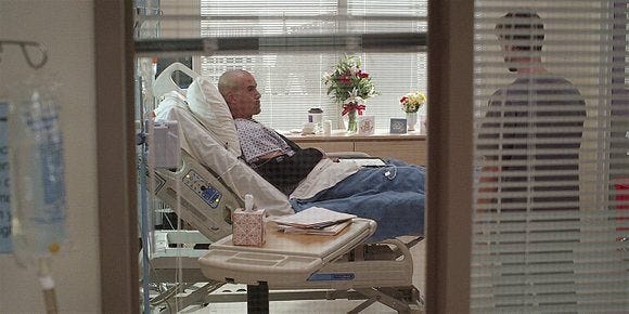 Walker comes back to give him an update, saying he’s looking better – though James ominously says he’s feeling a little worse (he probably should have told the nurse that, just saying…). Cordell is also too stuck on trying to solve the case to notice that James looks like shit, asking again if he remembers anything else and sharing that they can cross Serano off the list – that even Stan couldn’t even wrap his head around that.