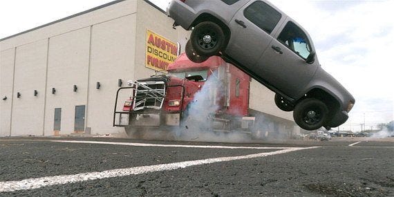 Walker drops back and Serano pulls ahead, reaching an intersection just as a tractor-trailer cuts him off – and T-bones his truck, sending it flying through the air in a pretty amazing stunt shot. (Which the fandom was lucky enough to see some behind-the-scenes footage of in fact).