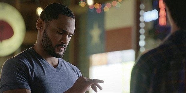 Back at the Side Step: Trey teaches August to flip bottles, then fumbles one and it shatters, and we realize he’s still having issues with his hand coordination. He helps Augie finish the memory wall with a memento from his first date with Micki, sharing a sort of heroic story and then wondering if “that guy’s still here anymore,” having a bit of an identity crisis after his injury.