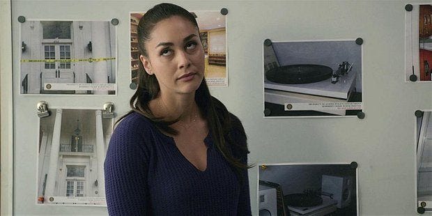 Micki gets a phone call and she and Cordell are called back to “HQ” which made me giggle because I’m not sure who calls it that, but Micki is all excited. Apparently, her buddy from the APD who called knows that she’s seen “this kind of thing” before – this thing being that a thief steals musical instruments, leaving a calling card in the form of a guitar pick.