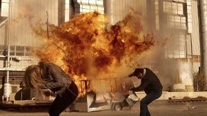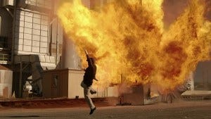 He pauses just as the entire place explodes, the other guy who tripped the wire flying through the air with the force of it.