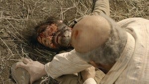 They grapple and Buck knocks the knife away and then brains Walter with a big rock, hitting him brutally over and over and over again, until he’s bloody and looks pretty damn dead, Sunny screaming in horror.