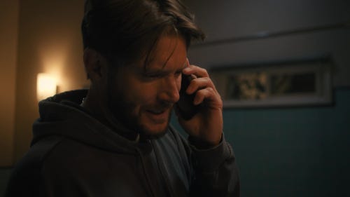 Later we see Mark spin out in his bathroom. It’s one of those scenes that Ackles excels at, the strong unemotional guy with his walls down, vulnerable looking in a gray hoodie and bare feet, hair disheveled (not a complaint at ALL). The “Supernatural” fandom already has a weakness for injured-sick-suffering Ackles in a hoodie, so this scene really hit hard.
