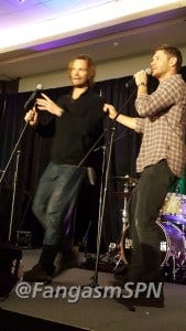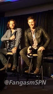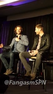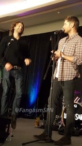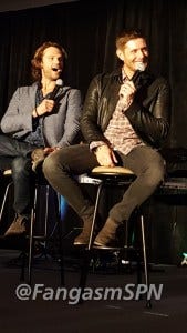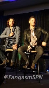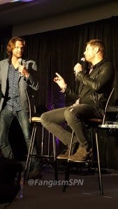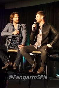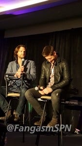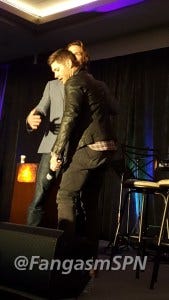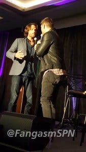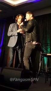 Jared started the re-enactment, and then Jensen had to keep correcting him, insisting that he didn’t so much stab Jared as Jared leaned right into the blade. Ouch.