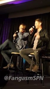They started talking about mishaps during filming, which brought up the Jensen-stabbing-Jared-in-the-thigh incident, which of course meant they had to re-enact it once again. Which I will never complain about. You can see the trust they have in each other in the way they are with each other physically – oh, and Jared kept right on going through that scene, btw.